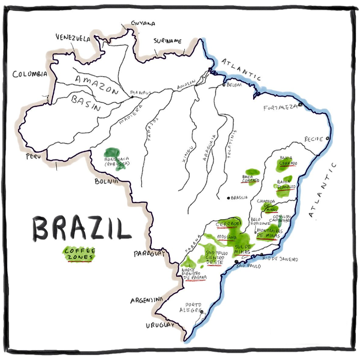 Major Regions: The top producing states include Minas Gerais (about 50% of the harvest), São Paulo, Espírito Santo, Bahia, Paraná, and Rondônia.